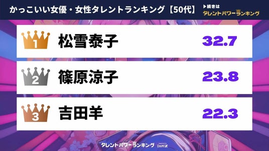 50代では、Netflix配信の映画「余命一年の僕が、余命半年の君と出会った話。(2024年)」や日本テレビ系ドラマ「マル秘の密子さん(2024年)」に出演している存在感抜群の女優が1位にランクイン。