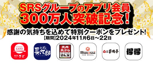 おかげさまでこの度、SRSグループ各ブランド(和食さと、にぎり長次郎、天丼・天ぷら本舗さん天、宮本むなし、家族亭、得得)のアプリ会員登録者数が300万人を超えましたので、多くのお客様にご利用いただいていることへの感謝の気持ちを込めてキャンペーンを開催します。キャンペーン対象のSRSグループ各ブランドのアプリを会員登録してご利用のお客様に、各アプリ内で特別クーポンをプレゼントいたします。この機会に、さらにお得にSRSグループの各店舗をご利用いただき、お食事をお楽しみください。