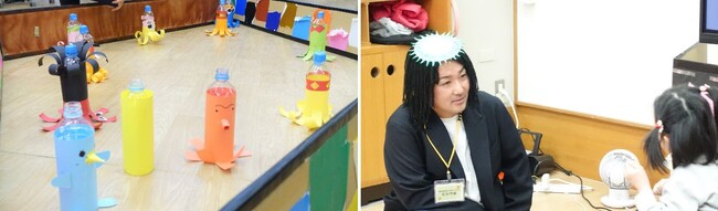 ペットボトル工作では、7R(※)の一つである『Repurposeリパーパス(新たなものに作り変える)』をもとに、使用済みのペットボトルに画用紙やシールを貼り、タコをイメージした工作を実施しました。一つ一つ異なるデザインのタコを制作し、その後はそれらを使った「タコ釣り」ゲームを2つのチームに分かれて行い、どちらがより多く釣り上げられるかを競い合いました。
