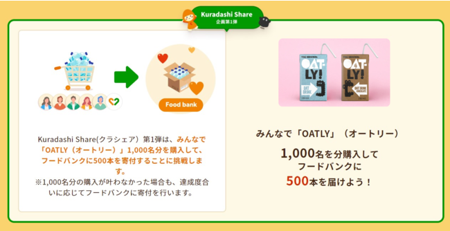 「Kuradashi Share」のサービス開始にあたり、プロジェクト第1弾として、「OATLY(オートリー)のオーツミルク1,000名分をみんなで購入し、500本のOATLYのオーツミルクをフードバンクに届けよう」というプロジェクトを開始いたします。人にも地球にもやさしい、サステナブルなオーツミルクを生み出すOATLYとのプロジェクトを通じ、やさしいお買い物を提案いたします。