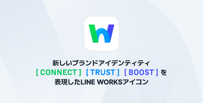 新しいアイコンを構成するパーツがそれぞれ「CONNECT」「BOOST」「TRUST」の3つの意味を持ち、「LINE WORKS」が提供する価値と、お客様のビジネス成長に対する貢献を表現しています。