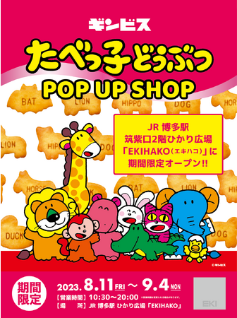 オリジナル商品の企画・制作・販売を軸に、企業・組織のトータルブランディングを手掛ける株式会社ヘソプロダクション(本社:大阪市福島区・代表取締役:稲本ミノル)は、2023年8月11日(金・祝)から9月4日(月)までの間、JR 博多駅 筑紫口2階 ひかり広場「EKIHAKO」にて、ギンビスの『たべっ子どうぶつ』をモチーフにしたグッズをたくさん集めた期間限定ショップ『たべっ子どうぶつ POP UP SHOP』を開催いたします。