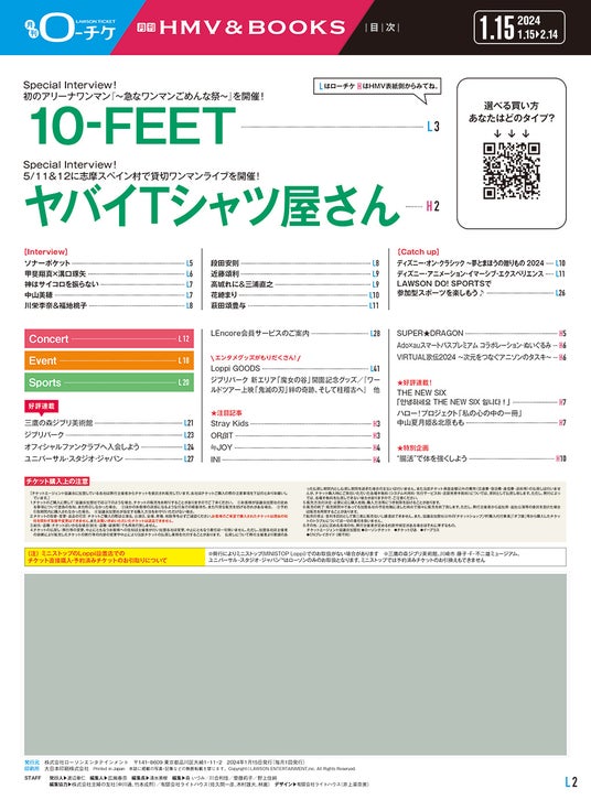 株式会社ローソンエンタテインメント(本社:東京都品川区、代表取締役社長:渡辺 章仁)が運営する「ローソンチケット」および「HMV&BOOKS」は、フリーペーパー『月刊ローチケ/月刊HMV&BOOKS』2024.01.15号を、1月15日(月)より、全国のローソンやHMVなどの店頭にて順次配布いたします。