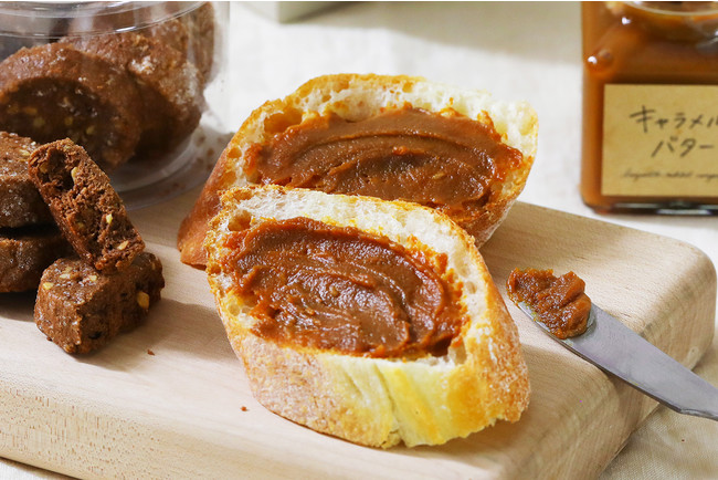オリジナルスプレッドの「キャラメルバター」は、コク深いキャラメルの味わいを充分にお楽しみいただけます。バゲットや食パンなどお好みのパンに塗っていただき、口の中でなめらかにとろける味わいや食感をお楽しみください。