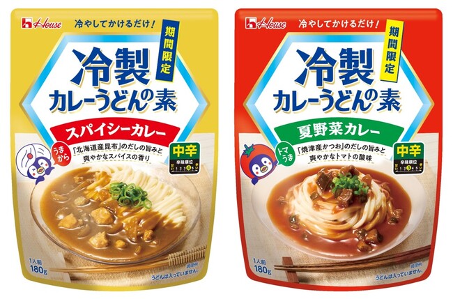 ハウス食品は、「冷製カレーうどんの素」<スパイシーカレー><夏野菜カレー>を、5月15日からスーパーなどで数量・期間限定で発売します。冷やしてかけるだけで“だしの旨みとスパイスが調和した、冷たいカレーうどん”が簡単に楽しめる本製品は、暑さを乗り切る『夏の新定番メニュー』となることを目指します。内容量180g、オープン価格(税別参考小売価格258円)。