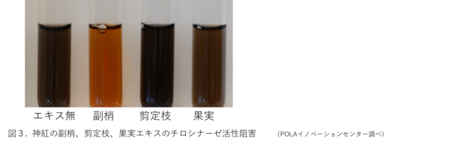 「神紅」の副梢(葉茎)より50%エタノール水溶液で抽出したエキスには、メラニン生成を高めるチロシナーゼの活性を抑制する効果があることを発見しました。この効果は、副梢(葉茎)エキスに顕著に見られました。(図3)