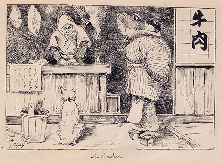 1877(明治10)年に東京大学で教鞭をとるため、いわゆる「お雇い外国人」として来日した米国の動物学者、エドワード・S・モース(1838-1925)は、日本人が生活の中にいる動物を親切に扱うことに驚きました。町の人々が、道に居座る犬や猫を邪魔しないように避けたり、またいだりして通行し、動物の名に「さん」付けして親しみを込めると『日本その日その日』で記しています。また、1882(明治15)年から日本に17年間滞在したフランスの画家ジョルジュ・ビゴー(1860-1927)は、日本の世相を伝える多くの絵画を残しましたが、そのなかには人と動物とをユーモラスに描き出したものも見られます。こうした描写には、日本の中では極めて当たり前すぎて誰も残すことがなかった、人といきもののかけがえのない日々が見出せるのです。彼らの描写から、外国人が印象的に見た江戸・東京の人々と動物の関係性を紹介し、本展の導入とします。
