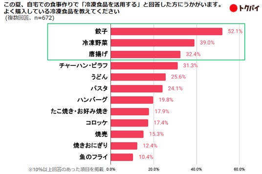 この夏、よく購入している冷凍食品の上位3品は「餃子」52.1%が最多、「冷凍野菜」39.0%、「唐揚げ」32.4%。冷凍食品の定番人気品が「下ごしらえ」「揚げる」「ゆでる」などの工程を省けることで猛暑下においても支持を集めています。続いて「チャーハン・ピラフ」31.3%、「うどん」25.6%、「パスタ」24.1%と、1品で食事として満足できる主食が人気となりました。