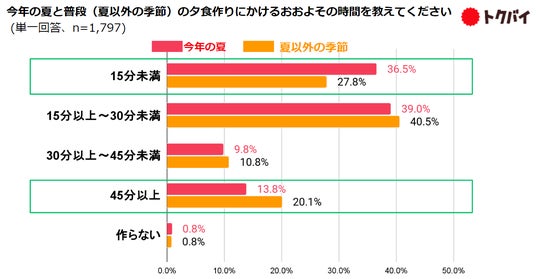 今夏の夕食作りにかける時間にも変化があり、中でも「15分未満」で作ると回答した割合は36.5%で、夏以外の季節27.8%と比べると9ポイント上回る結果となりました。夕食作りに「45分以上」かける割合も、夏以外の季節では20.1%のところ、今年の夏は13.8%と大きく減っています。