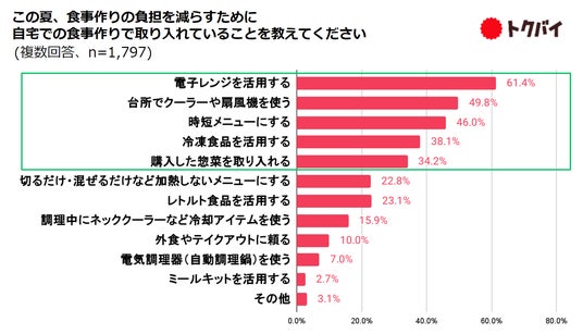- 今夏の食事作りの悩みTOP3は「暑い台所に立つこと・調理作業」「食材価格の上昇」「献立決め」、食事作りに取り入れていることTOP3は「電子レンジの活用」「台所でのクーラーや扇風機の使用」「時短メニューの活用」