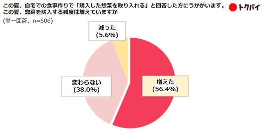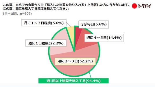市販の惣菜を取り入れている人のうち、56.4%がこの夏「購入する頻度が増えた」と回答しました。購入頻度は「週に2~3回」52.2%が最多となり、9割以上が週に1回以上惣菜を購入している結果となりました。
