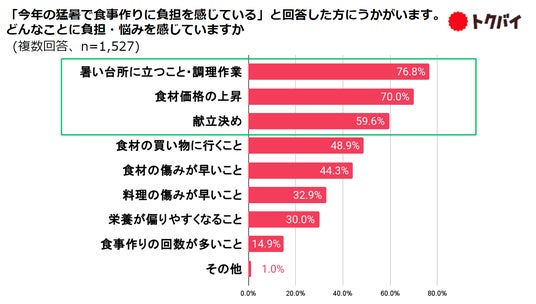猛暑下の食事作りに負担を感じている人に具体的な負担・悩みをたずねたところ、「暑い台所に立つこと・調理作業」76.8%が最多、「食材価格の上昇」70.0%、「献立決め」59.6%と続きました。
