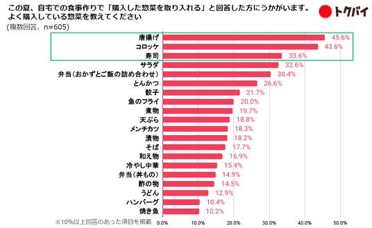 この夏、よく購入している惣菜の上位3品は「唐揚げ」45.6%、「コロッケ」43.6%、「寿司」33.6%。いずれも人気の惣菜であり、猛暑下でとくに自宅調理の負担が大きい揚げ物が上位に入る結果となりました。