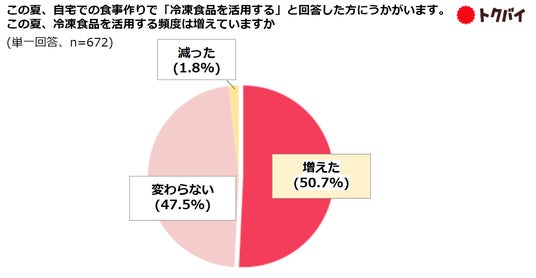 市販の冷凍食品を活用している人のうち、50.7%がこの夏「活用頻度が増えた」と回答しました。活用頻度は「週に2~3回」46.6%が最多、約9割が週に1回以上冷凍食品を活用している結果となりました。