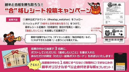 期間中、SNSキャンペーンも実施します。綿半公式X(旧Twitter)アカウントをフォローのうえ、限定デザインレシートの画像、指定のハッシュタグ、そして「達成したいこと」を投稿してください。ご応募いただいた方の中から抽選で3名様に、「達成したいこと」を絵馬にした限定ポストカードをお送りします!