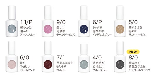 ネイルカラーに着想を得たカラーバリエーションは、ネイルを楽しむように季節やその日の気分に合わせて選んでいただける色展開に、2023年6月のレディスクラブUM500の発売以来、新たに8/0チャコールブラックを追加し、全8色展開となります。