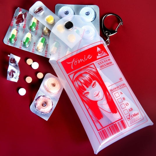 手に取るたびに富江の世界観に浸れる、献血バッグ風のプリントが耽美で洒落たデザイン。