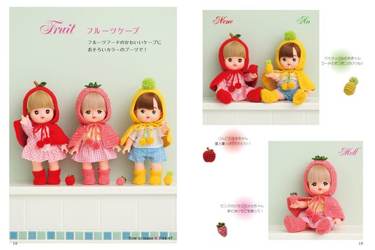 メルちゃんの市販のお洋服にニットを合わせても。フルーツ、クマなどの動物、ケーキなどかわいいかぶりものもたくさん掲載しています。