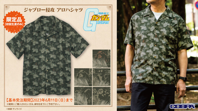 ジャブロー侵攻 アロハシャツは初回生産のみの限定品で、コスパ通販(https://cospa.co.jp/)ほかにて予約受付中。2023年8月上旬発売予定。
