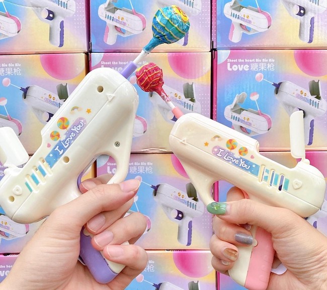 K-POP アイドルやTiktokで2億回再生されたことから話題になった、今注目されている商品です。日本では入手困難でしたが、サンキューマート独自のルートで10月に日本初上陸を果たした際には即完売しました。本体に棒付きキャンディーをセットしてから引き金を引くと飛び出し、さらにLED が光りながら「I LOVE YOU」の文字と音が出るユニーク映えアイテムです。