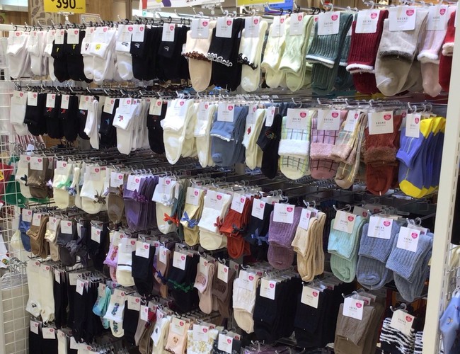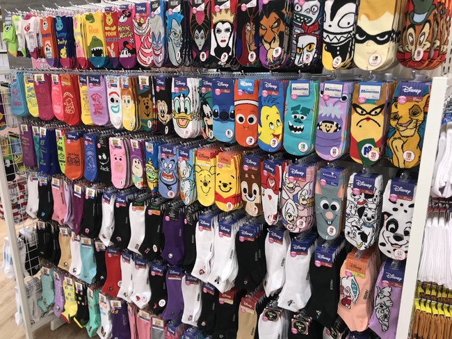 キャラクターソックスもまさかの2足で390円。ディズニーやワンピースなど、30種を超えるキャラクターアイテムを展開しています。