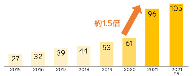 2020年は新型コロナウイルス拡大による緊急事態宣言発令などがありましたが、2020年から2021年にかけての1年で対前年比1.5倍まで店舗数を拡大しました。その勢いは衰えることなく100店舗目に到達いたしました。