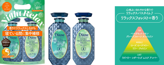 「ナイトリペア リラックス」は、髪がうるおってととのうGABA(※1)やカカオバター(※2)を使ったシャンプーと、美容保湿成分をたっぷりとじこめたビタミンE(※3)カプセルが配合されているトリートメントで、寝返りによる寝具等との摩擦によって大きなダメージを受けている髪を就寝中に補修。心地よい、さわやかなリラックスフォレストの香りで、リラックスしながら寝ている間に補修し、ツヤ髪へと導きます。