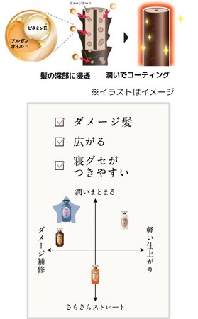 コラーゲン(※5)の中にビタミンE(※3)とオーガニックアルガンオイル(※6)を閉じ込めたカプセルをナイトリペアシリーズのトリートメント、ヘアマスクに世界初(※4)配合。髪になじませるとカプセルがプチっと弾け、美容成分が髪のダメージホールに浸透。傷んだ髪の深部まで入り、補修します。