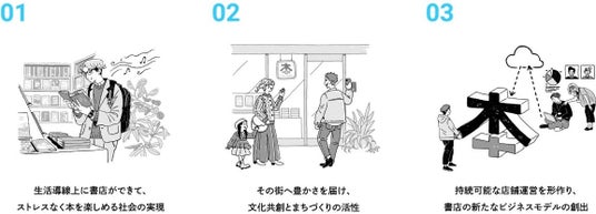 全国的に書店軒数が減少しているなかで、人々の生活動線上から本とのリアルなタッチポイントがなくなることによって、読書習慣が失われてしまうことが危惧されています。この状況に対し日販は、現代の人々のライフスタイルに合った本との新たな出会いを提供し、人々のニーズを満たすとともに、地域の文化も守ることができる持続可能な書店モデルの開発に挑戦しています。