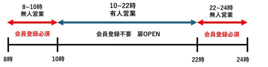 従来は、10時~22時の12時間営業でしたが、サポートセンターによる無人営業の完全サポートにより、早朝の8時から10時と、深夜22時から24時の4時間を無人営業時間とすることで、書店スタッフを配置することが難しい早朝や深夜の営業が可能となります。無人営業時間は、LINE会員証で入店の管理を行います。このことにより、顧客の利便性が向上し、人件費をかけずに書店の収益改善も見込まれます。