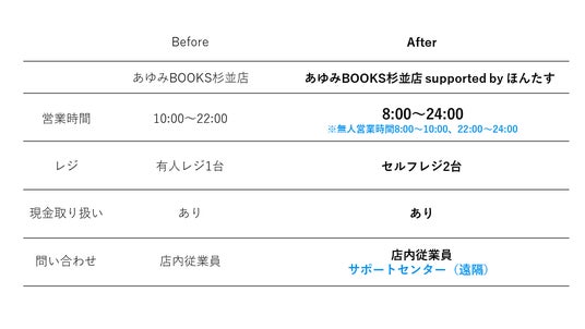 そして今回、1号店で検証してきた完全無人運営のノウハウを活かした、有人・無人のハイブリッド型営業を叶える省人化ソリューションの初導入店舗として、ほんたす2号店目となる「あゆみBOOKS杉並店 supported by ほんたす」を2024年秋にリニューアルオープンいたします。
