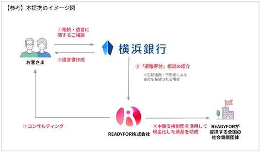 本提携では、横浜銀行が遺贈寄付を検討されているお客さまのご希望に応じて「レディーフォー 遺贈寄付サポート窓口」を紹介し、当窓口では、寄付先候補として公益団体等のご案内・マッチングを行います。中間支援財団等を活用した不動産や有価証券での寄付にも柔軟に対応できる体制が築けることで、より多くのお客さまのニーズに対応できることが期待されます。