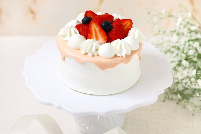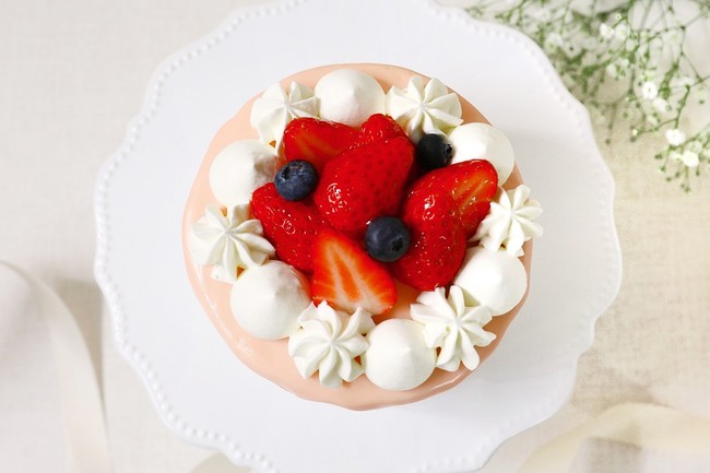 真っ白なケーキにやさしいピンク色のグラサージュと、艶やかな苺で飾り付け。
