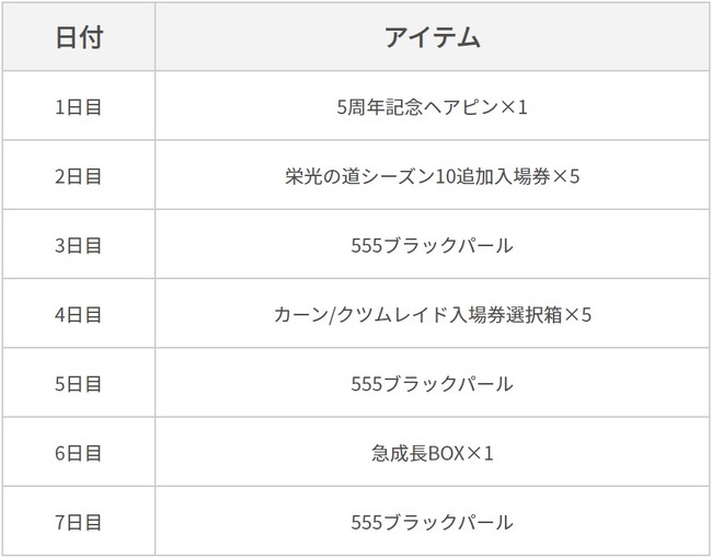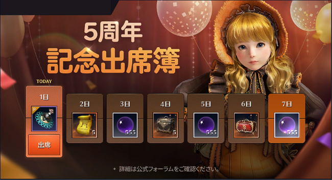 上記記載の「5周年記念出席簿」に参加することで1日目に獲得できます。