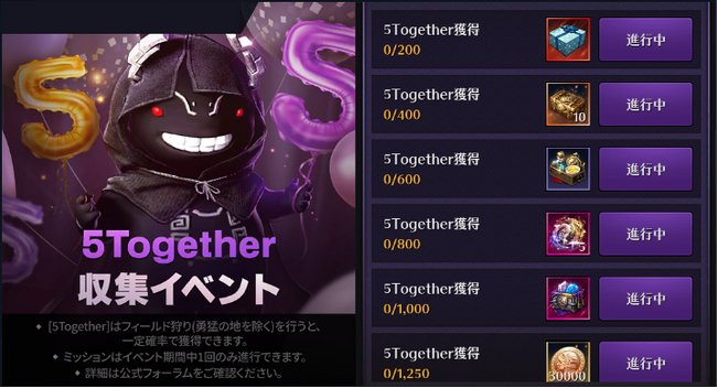 期間中、フィールド狩りを行うと、一定確率で獲得できる [5Together] を集めると、イベントページから報酬を獲得することができます。詳細は以下のURLをご確認ください。
