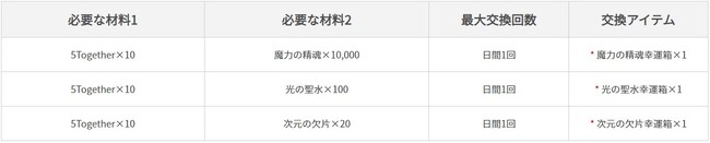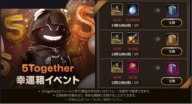 イベント期間中、フィールド狩りを行うと、一定確率で「5Together」を獲得できます。獲得した「5Together」及び「必要な材料2」に記載されているアイテムを利用し、イベントページにて「交換」ボタンをタップすると、特定のアイテムと交換することができます。