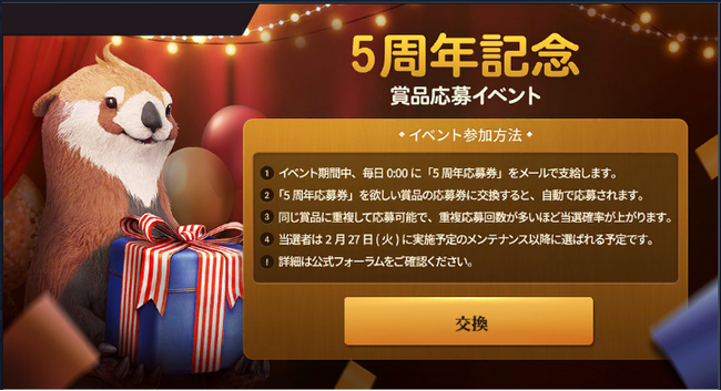イベント期間中、毎日0:00に「5周年応募券」をメールで支給します。「5周年応募券」を欲しい商品の応募券に交換すると、自動で応募されます。同じ賞品にも重複して応募することができ、重複応募回数に比例して当選確率が高くなります。