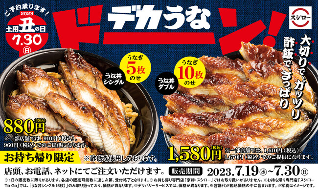 株式会社あきんどスシロー(本社:大阪府吹田市、代表取締役社長:新居 耕平)は、7月30日(日)の“土用の丑の日”に合わせて、スシローのこだわりがつまった大切りのうなぎをふんだんに使用した、お持ち帰り限定の「うな丼」を、シングル・ダブルの2種類で全国のスシロー(※)にて今年も発売いたします。発売に先がけ、6月19日(月)より予約受付を開始いたします。
