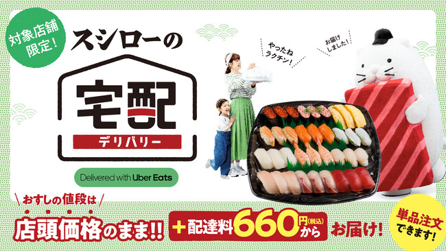 スシローでは「UberEats」、「出前館」など、デリバリーサービスと提携しております。また、おすしの値段は店頭価格そのままで単品からご注文できるデリバリーサービス『スシローの宅配 Delivered with Uber Eats』も一部店舗にてご利用いただけます。