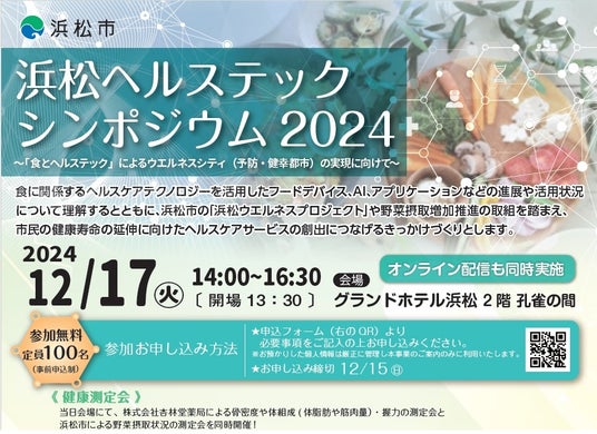 食に関係するヘルスケアテクノロジーを活用したフードデバイス、AI、アプリケーションなどの進展や活用状況について理解するとともに、浜松市の「浜松ウエルネスプロジェクト」や野菜摂取増加促進の取組を踏まえ、市民の健康寿命の延伸に向けたヘルスケアサービスの創出につなげるきっかけづくりとします。