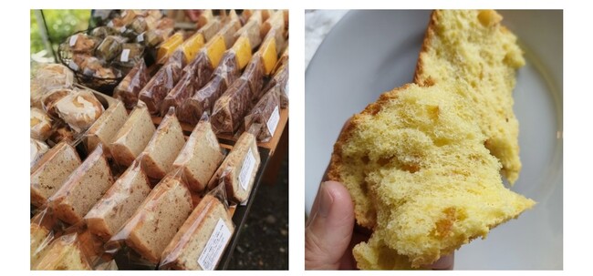 シフォンやマフィン、ヴィーガンクッキーなど、農薬、無化学肥料の素材を使い、体に優しいお菓子を作っています。なかでもふわふわのシフォンケーキは、手で割いて召し上がっていただくとその柔らかさを実感します。使用している材料は有精卵に地粉と菜種油を使い、水分は水のみ。素材がシンプルなだけに、卵の味がダイレクトに伝わります。プレーン、有機バナナ、有機ほうじ茶、かぼちゃなどさまざまなバリエーションを用意いたします。