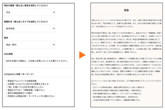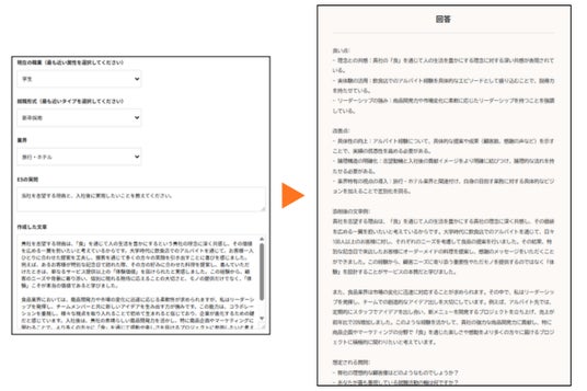 志望業界とESの質問、入れ込みたい内容やキーワードを入力するだけで、AIがES回答の“叩き台”を短時間で作成します。ES作成にかかる時間を削減し、就職活動における貴重な時間を、「自分の言葉」や「自分の思い」の整理に充てることができます。