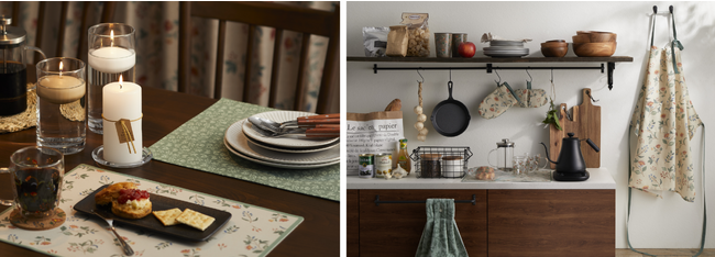 アースカラーやボタニカル柄のランチョンマットを敷いて、いつもの食卓を手軽に秋仕様にチェンジ。ぱっと目を引くモチーフがおそろいのエプロンとミトン、鍋つかみを飾るように壁に掛ければ、キッチンにも季節感が漂います。