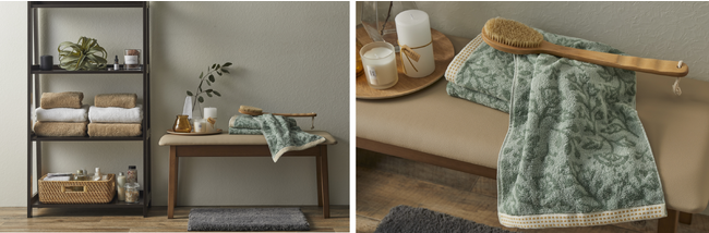 ちょっと秋の気分を取り入れるなら、タオルの交換がおすすめ。落ち着いたグリーンのボタニカル柄のタオルは、ヘムのイエローのステッチがおしゃれなアクセントに。手にする度に季節を感じられます。