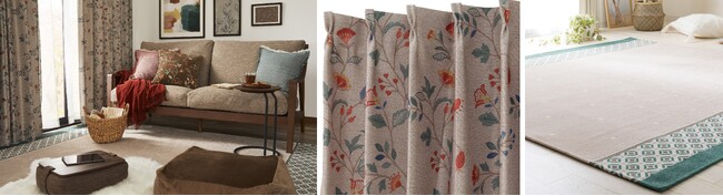 華やかさの中にも落ち着きがあるクラシカルなボタニカル柄カーテン、足元からぬくもりを感じるやさしいベージュのラグ。足元や窓辺に秋らしい色や素材を取り入れるだけでも、お部屋の印象はガラッと変わります。