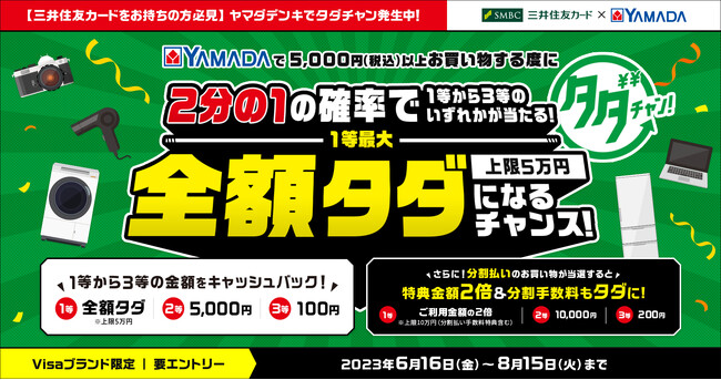 株式会社ヤマダホールディングスのグループ企業である株式会社ヤマダデンキ(本社:群馬県高崎市、代表取締役社長:上野 善紀、以下、ヤマダデンキ)は、三井住友カード株式会社(東京本社:東京都江東区、代表取締役社長:大西 幸彦、以下、三井住友カード)とタイアップし、全国のヤマダデンキ店舗、及び公式通販サイト「ヤマダウェブコム」でのお買い物が、2分の1の確率で最大全額タダになるキャンペーン※「ヤマダデンキ タダチャン!」を6月16日(金)より開始いたしました。