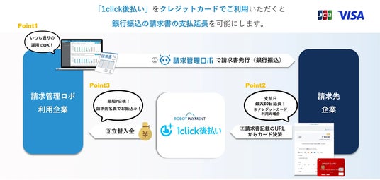 BPSP(Business Payment Solution Provider)に準拠した請求書カード払いサービス「1click後払い」は、売り手企業が発行した請求書を受領後、買い手企業がカード決済を選択できるサービスです。「1click後払い」を利用することにより、請求書を送付した売り手企業に対して、当社が買い手企業に代わって請求金額を支払います。その後、買い手企業による実際のキャッシュアウトは、クレジットカード利用の場合、クレジット会社の支払いサイクルに合わせて最大60日経過した後に引き落とされます。