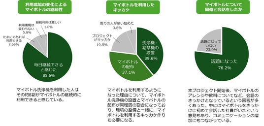 なお、本プロジェクト期間中に76.2%の社員がマイボトルのアレンジや飲む飲料などを話題としており、マイボトルの利用が社員間のコミュニケーションの増加にも寄与していると考えられる。
