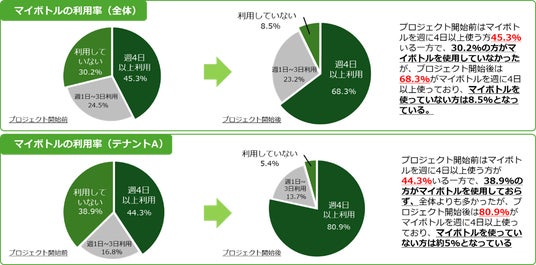 「テナント向けプログラム」に参加した4社の社員を対象にアンケート調査を実施した。その結果、プロジェクト開始前と開始後では週4日以上マイボトルを利用する人の割合が23.0%増加し、テナント毎の集計では約36.6%増加したテナントもあった。また、マイボトルの利用の継続性についても85.6%が継続的に利用できると感じでおり、マイボトルの利用環境を整えることで、自然とマイボトルを利用できる環境構築ができていると考えられる。
