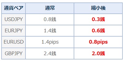 ※上記の縮小後スプレッドは「1,000通貨コース」でご提供しております。